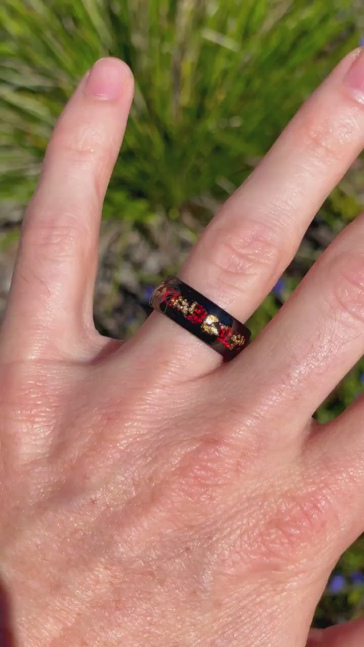 ►This hand-crafted Red Opal and Gold Leaf Ring Set, featuring matching his and hers tungsten bands, combines modern elegance with timeless design. The vibrant red opal and delicate gold leaf inlays create a stunning contrast against the polished black dome finish, making these rings a perfect choice as a wedding ring set, heartfelt promise rings, or a unique anniversary gift. Available in 8mm and 4mm widths, these comfort-fit bands are designed for lasting wear and style. Add a personal touch with custom engraving to create meaningful keepsakes that celebrate your love story in a truly unforgettable way.