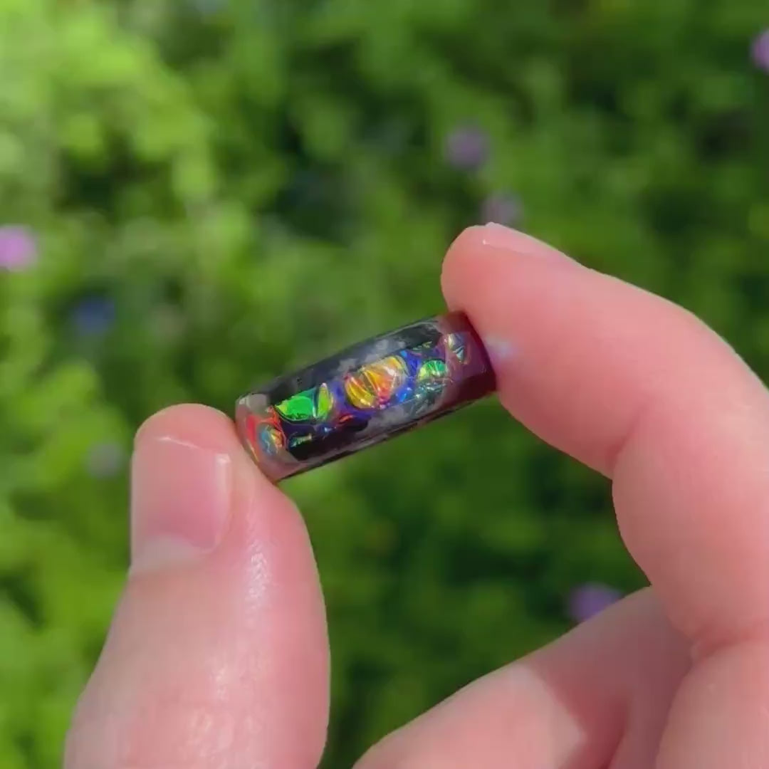 ►This ring contains authentic Dichrolam burl created by John Blazy and his team. His flagship burl textures involve hand patterned dichroic films that are more vibrant and colorful than traditional opal materials.