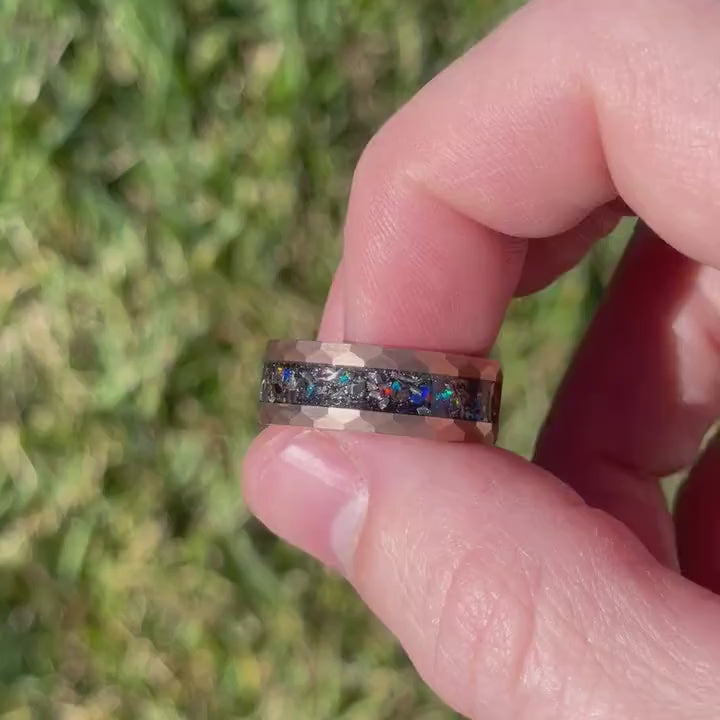 Rose Gold Meteorite Opal Ring, Mens Wedding Band, Hammered Tungsten Ring, Galaxy Ring, Authentic Meteorite Ring Men, Opal Band, Engraving