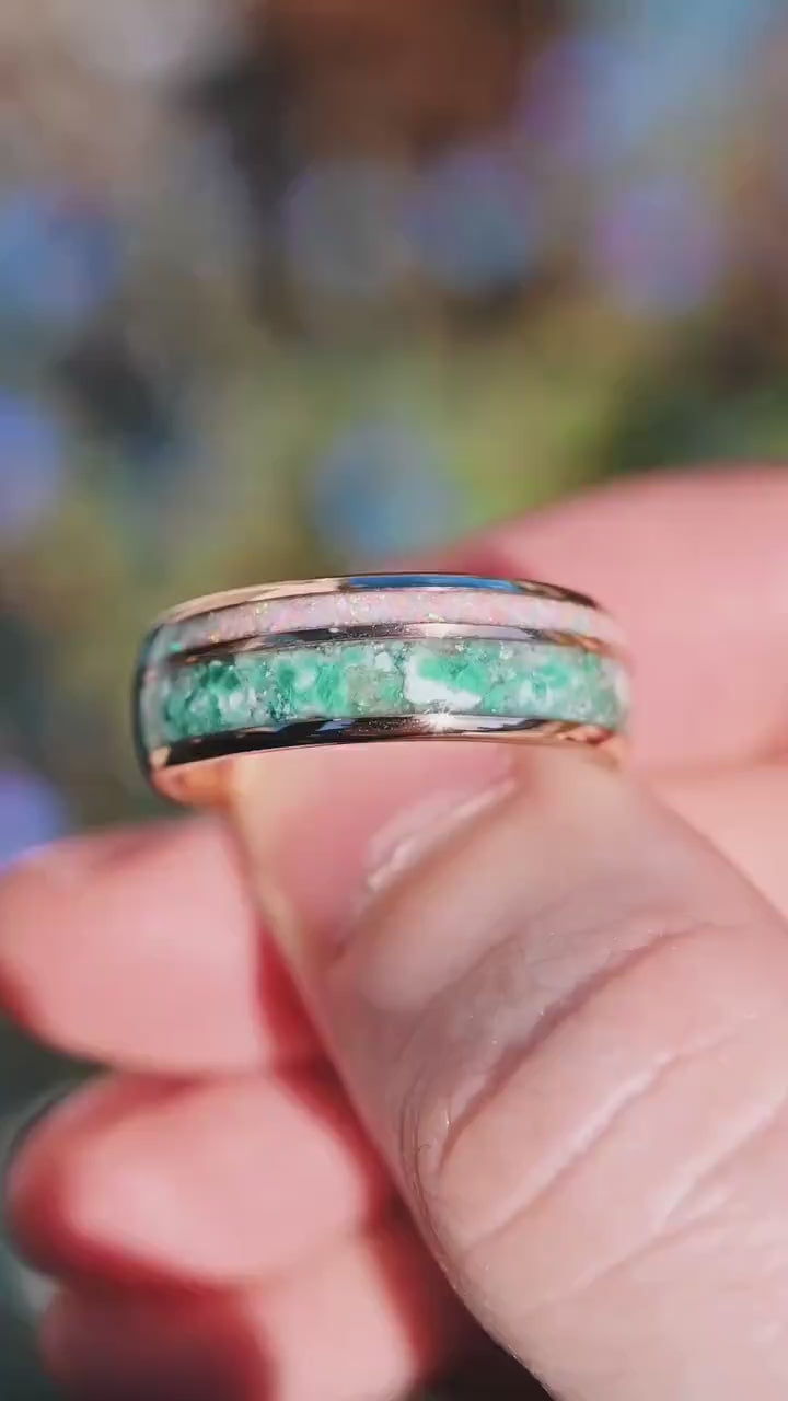 This striking men’s wedding band showcases a blend of green moss agate and white fire opal, capturing the essence of earthy elegance. Set in rose gold tungsten, it’s a nature-inspired piece that stands out with its unique character. Add a personal engraving to make it a truly meaningful gift.