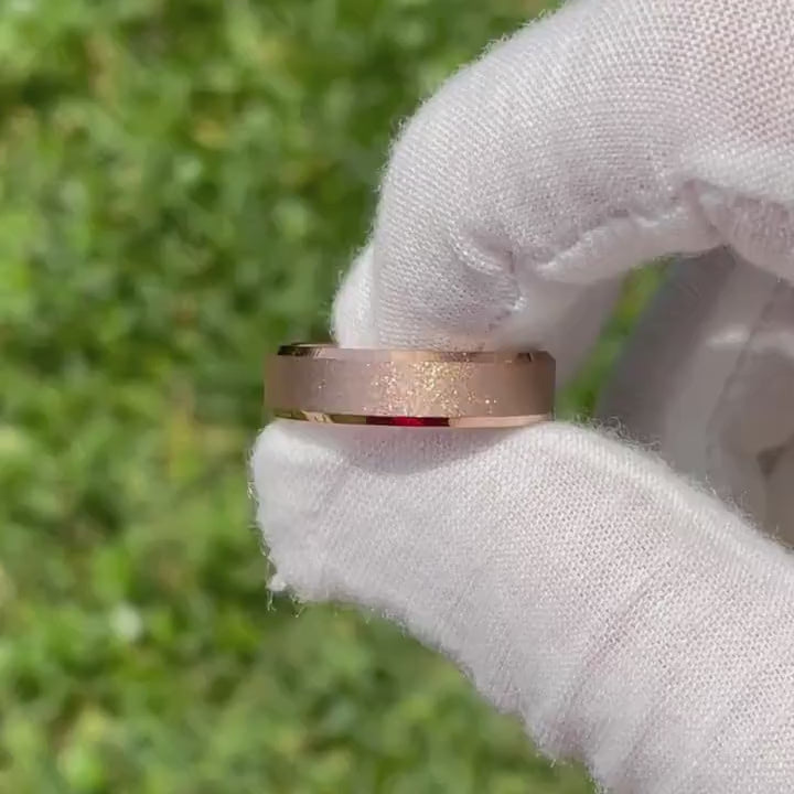 The Flat Sandblasted Rose Gold Tungsten Ring is a stunning and unique wedding band option for both men and women. Hand-crafted with precision, this ring is made from high-quality tungsten carbide material and features a beautiful rose gold plating. The band's width is 6mm, offering a comfortable fit for everyday wear. The design showcases a combination of sandblasted and polished rose gold textures, giving it a truly unique and eye-catching appearance.
