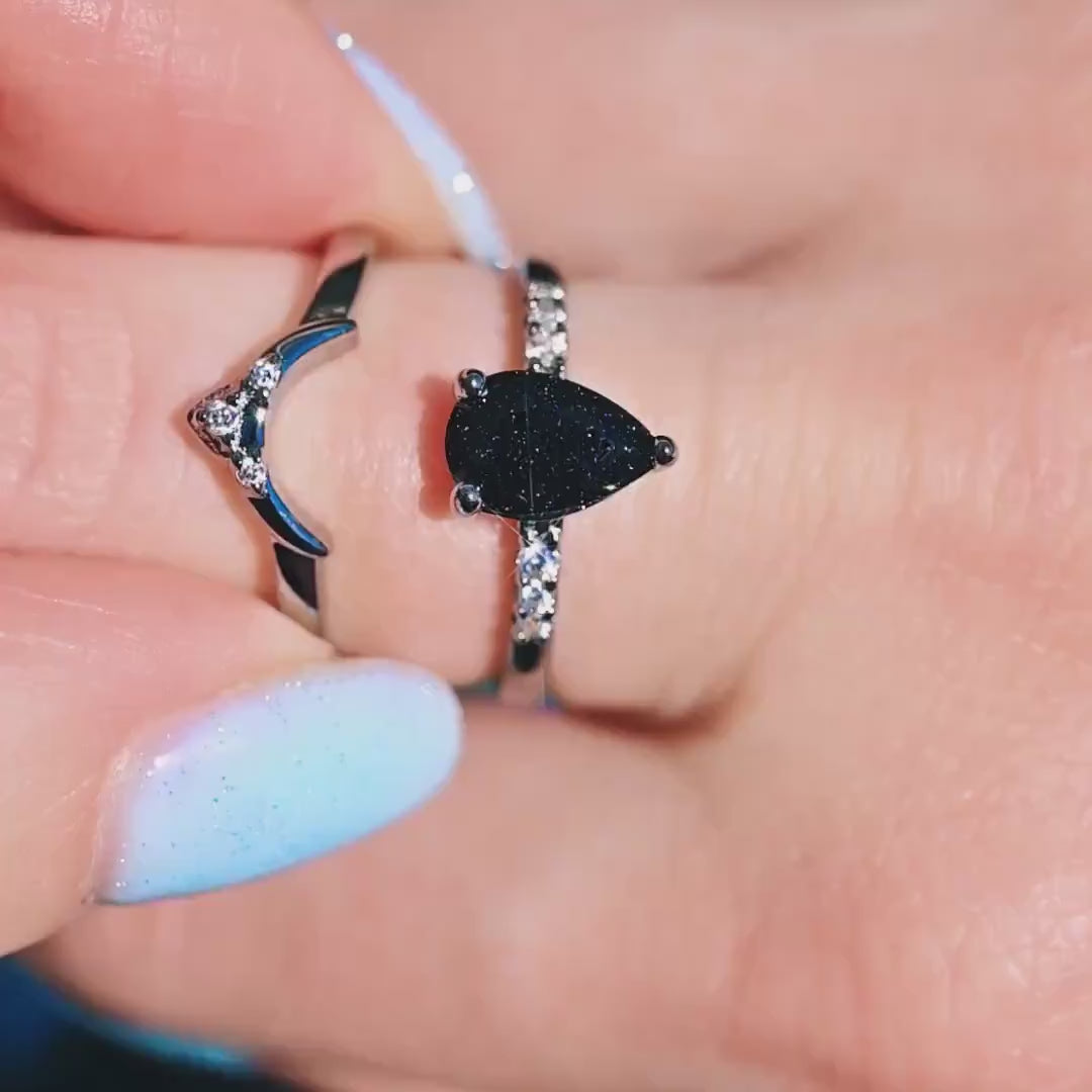 Shimmering like stars in the night sky, the sandstone in these matching rings evokes the beauty of Velaris. His tungsten band features a glowing moonstone strip, while her black-plated sterling silver ring is finished with a crown accent - perfect for couples drawn to the stars.