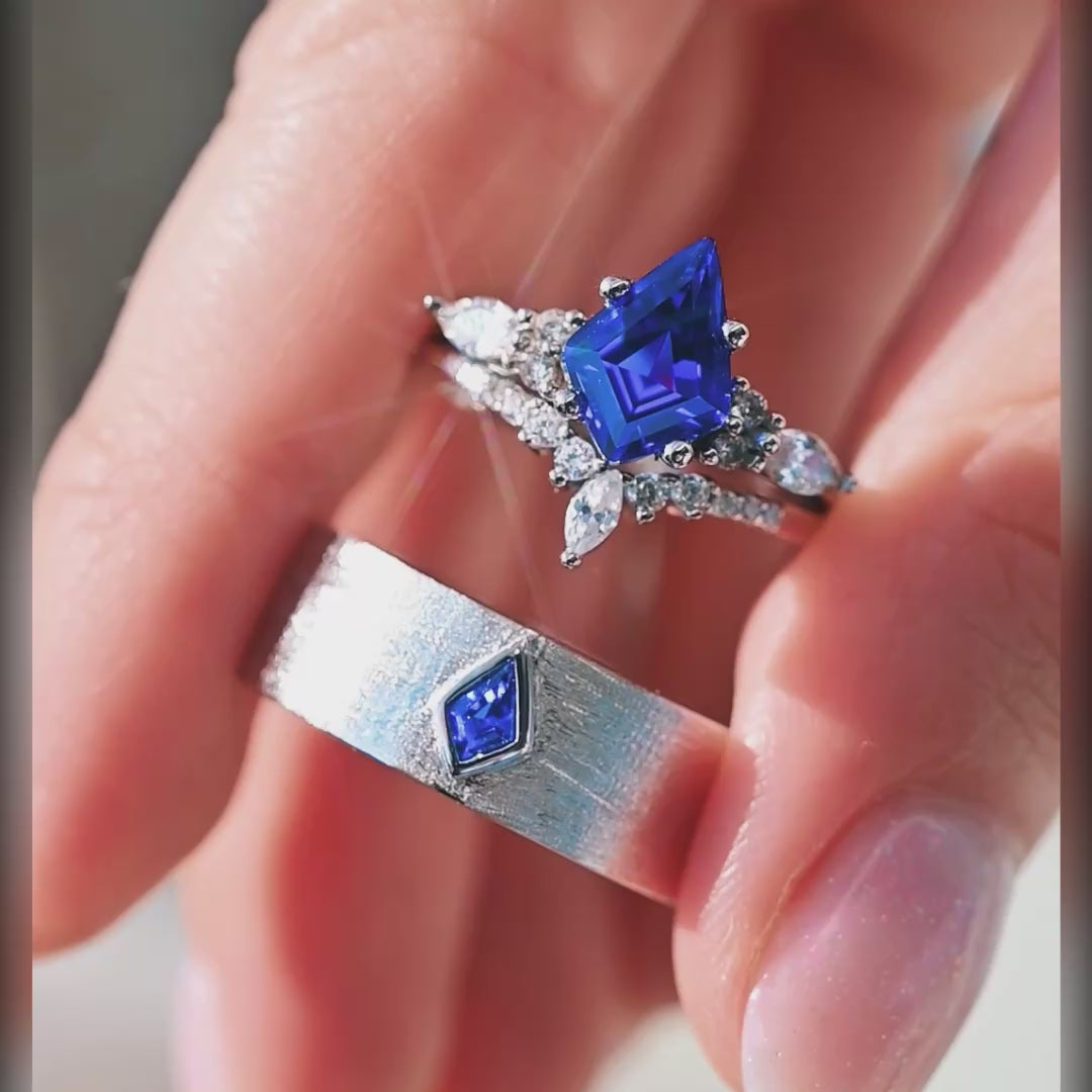 Meet your perfect match in silver and sapphire. This his-and-hers couples ring set is crafted in 925 sterling silver, each ring centered by a striking kite-cut blue sapphire — her kite cut design radiates brilliance, his brushed band keeps it effortlessly sleek.