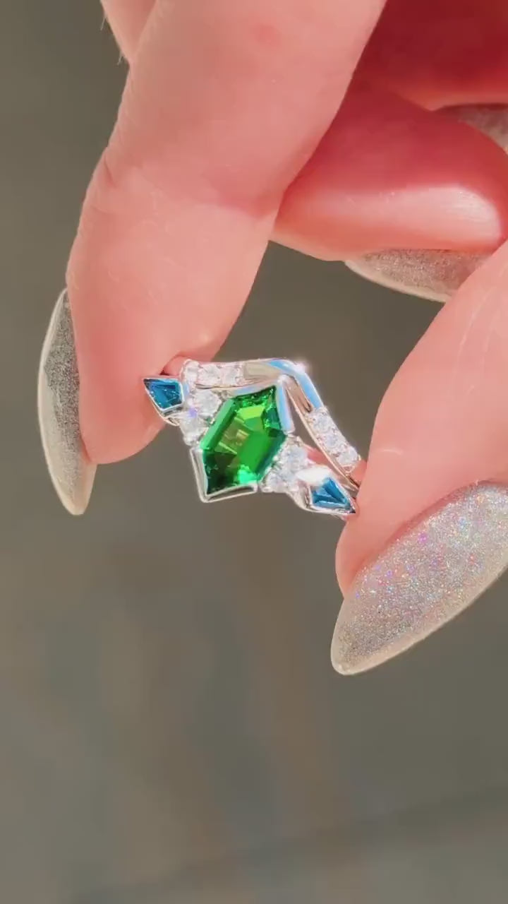 Tsavorite Silver Wedding Ring for Her, Rosette Nebula Ring Set, Elongated Hexagon, Alternative Engagement Ring Set, Woman Wedding Ring