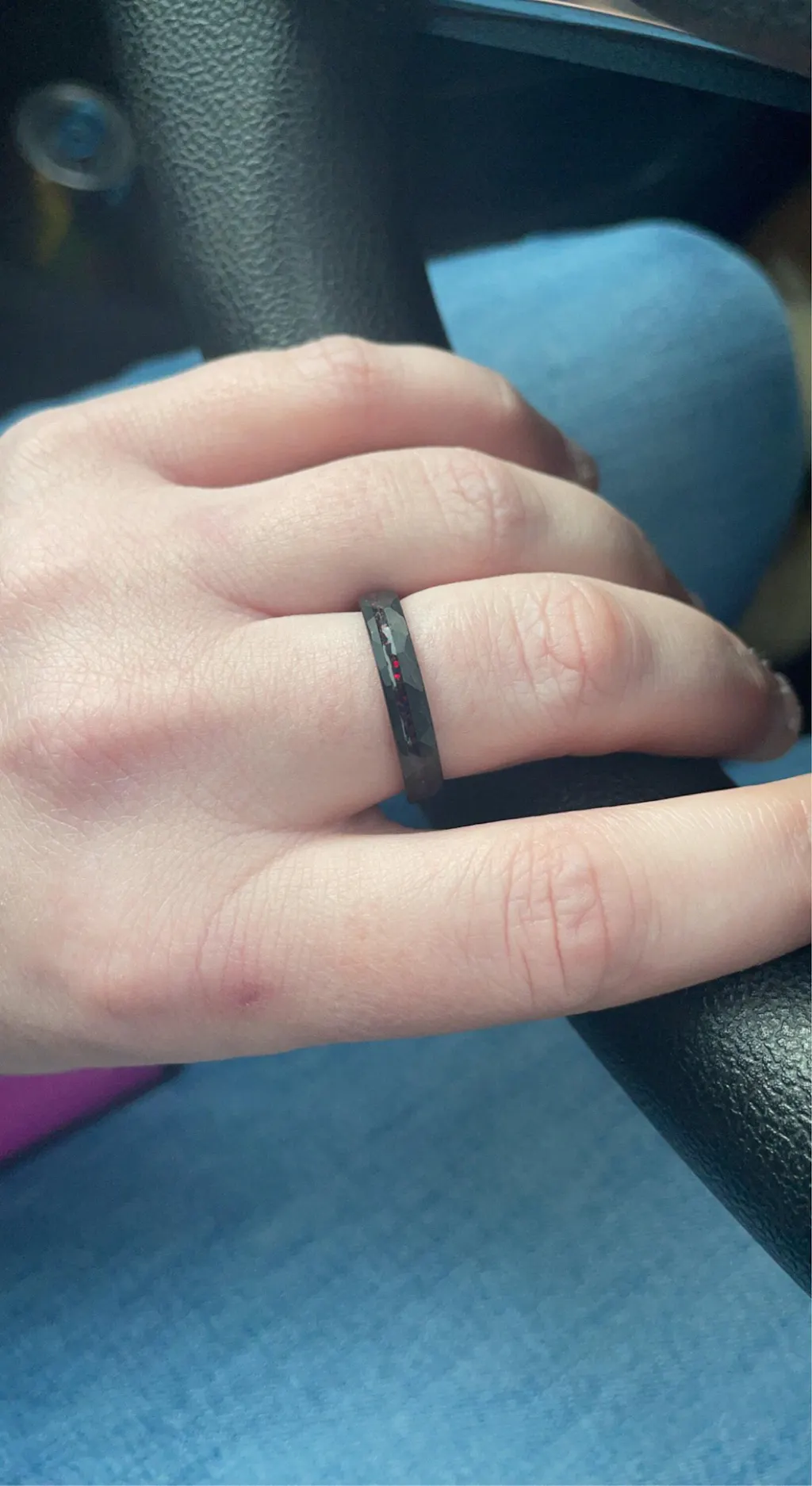 ►This hand crafted tungsten ring features brushed, hammered tungsten and beautiful crushed black fire opal. Having an incredible resistance to scratching, your tungsten band is 4 times harder than titanium, 5 times harder than steel, and 10 times harder than gold. Its hardness is second only to diamonds. Tungsten will maintain its luster, beauty, and shape forever. Its eternal strength is the perfect symbol of eternal love.