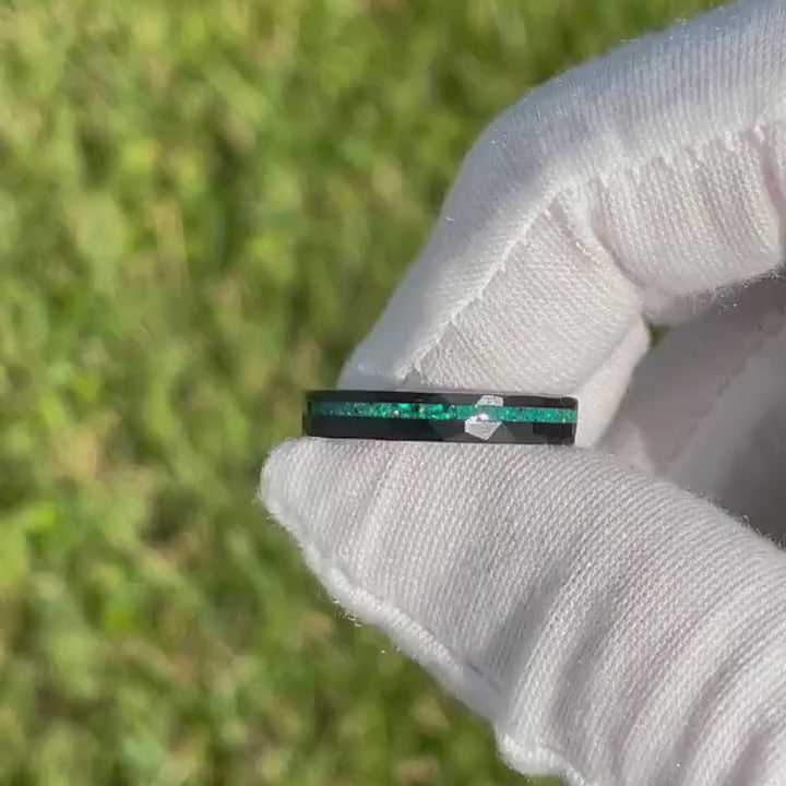 ►This tungsten wedding band features a striking crushed green opal inlay, set in a sleek 4mm black tungsten band with a hammered, matte brushed finish. The flat design and comfort fit ensure durability and style, making it a perfect choice for a wedding ring, promise ring, or anniversary gift. The unique green opal adds a vibrant touch, while the option for custom engraving allows you to personalize this ring, making it a meaningful symbol of love and commitment for both men and women.