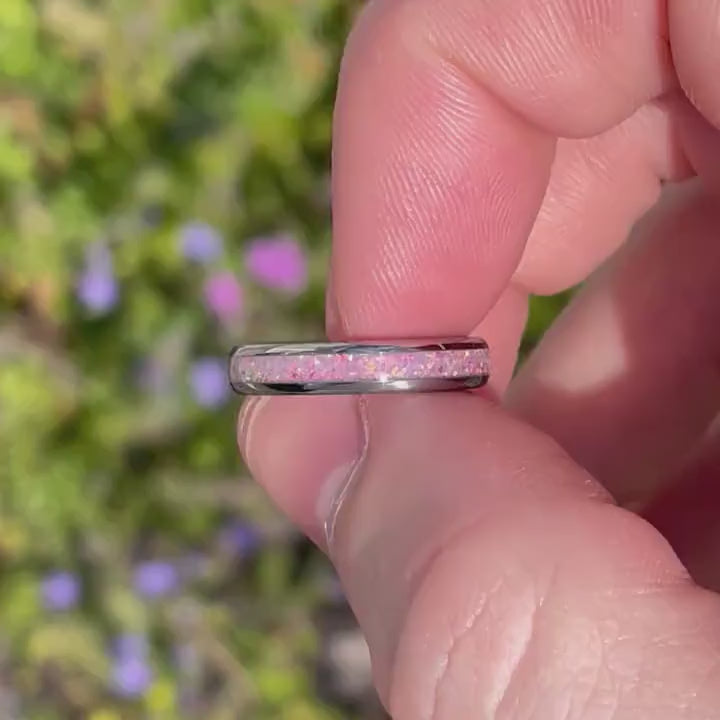 Unicorn Fire Opal Ring, Silver Tungsten Wedding Band, No Plating, Polish, Dome, Unique Ring, Men Women Ring, October Birthstone, Engraving