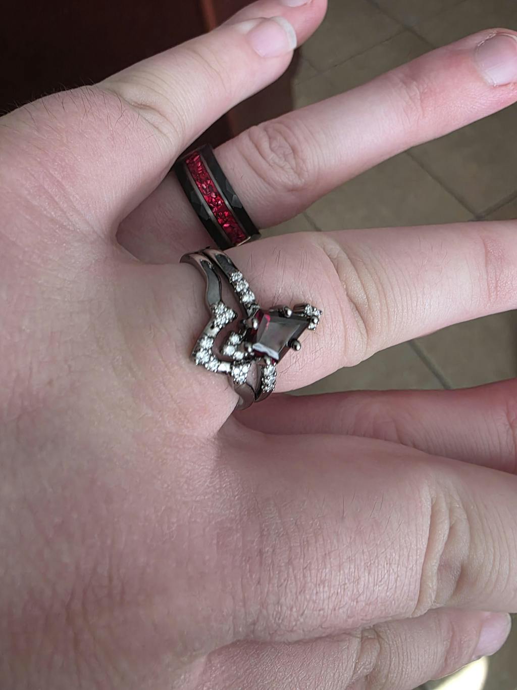 Weaver Garnet Couples Ring Set – A unique choice for couples who want something different. The deep red garnet symbolizes love and passion, making it a meaningful wedding, engagement, or promise ring set.