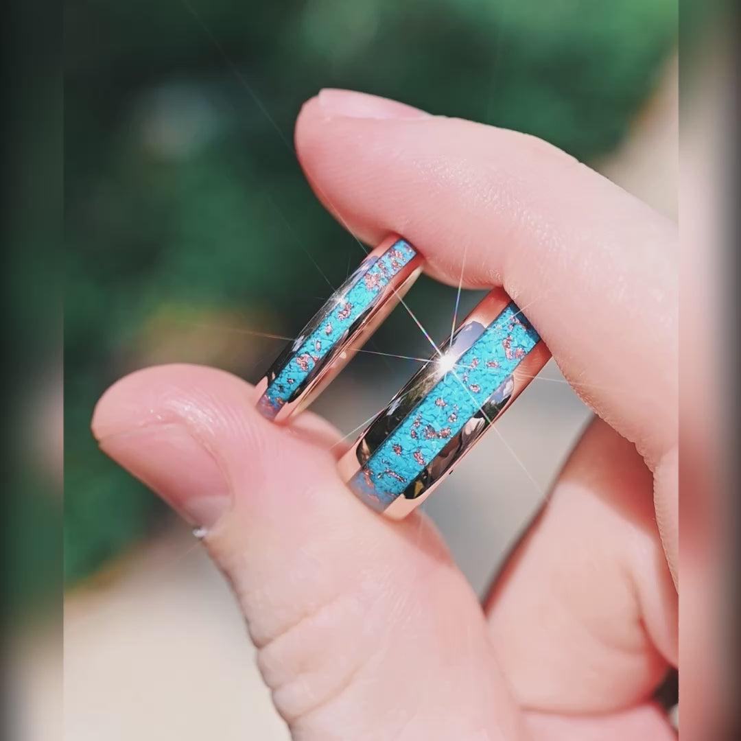 This matching couples ring set features durable tungsten with crushed turquoise and rose gold foil inlay. Inspired by Western style, turquoise is a symbol of protection, balance, and lasting connection. A meaningful choice for weddings, anniversaries, or everyday promises.