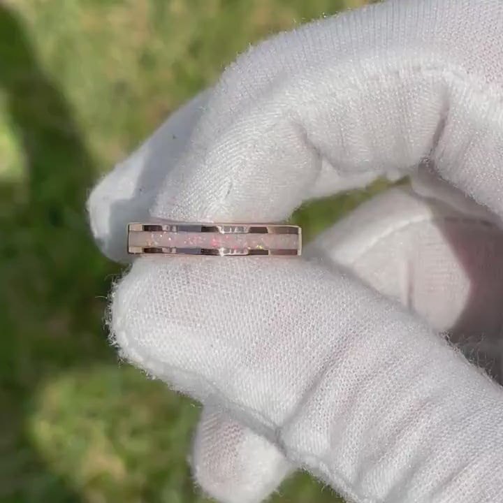White Fire Opal Ring, Rose Gold Wedding Band, 4mm Ring, Polished, Flat, Unique Promise Ring, Men Women Ring, White Opal Band, Ring Engraving