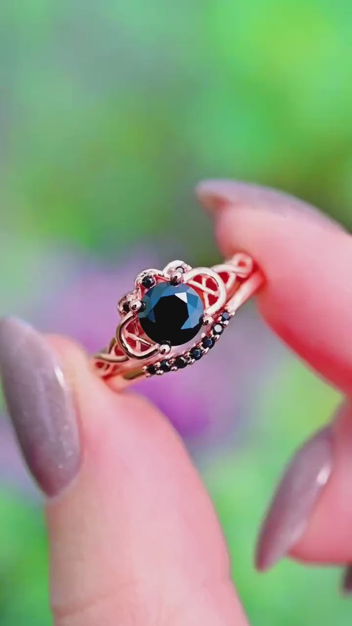 Womens Black Diamond Engagement Ring, Rose Gold Celtic Knot Wedding Ring, Alternative Promise Ring, Unique Ring for Her, Onyx Bridal Set