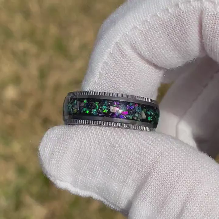 Zirconium, Meteorite and Galaxy Opal Wedding Band, 8mm Black Ring, Milgrain, Dome, Polished, Comfort Fit, Gift for Him, Unique Ring